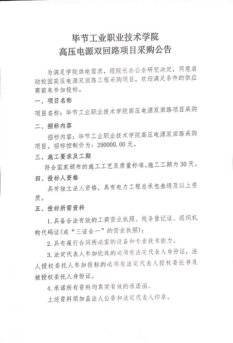 畢節(jié)工業(yè)職業(yè)技術(shù)學(xué)院高壓電源雙回路項(xiàng)目采購公告