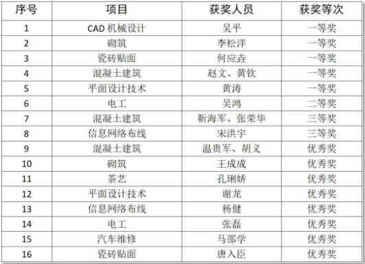 近年來,我院一直注重發(fā)揮技能大賽在促進“三教”改革,提升人才培養(yǎng)質量中的引領作用,不斷完善人培方案和人才培養(yǎng)體系,加強以賽促教、以賽促學、以賽促訓、以賽促建,有效促進了產教深度融合發(fā)展、校企密切合作育人,職業(yè)教育培養(yǎng)質量顯著提升。 (頒獎現(xiàn)場) 本次比賽榮獲佳績,進一步激發(fā)了我院師生學習技術、鉆研業(yè)務的熱情,多層次促進了師生整體素質和技能水平的提升。 (我院部分獲獎師生合影) 今后,我院將再接再厲,努力打造一支技藝精湛、素質良好的人才隊伍,為今后的各級技能大賽作準備,為畢節(jié)市經濟社會高質量發(fā)展提供有力的技能人才支撐。 (我院獲獎情況一覽表)