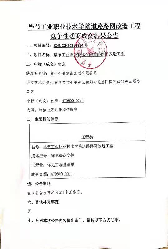 畢節(jié)工業(yè)職業(yè)技術(shù)學(xué)院道路路網(wǎng)改造工程競(jìng)爭(zhēng)性磋商成交結(jié)果公告