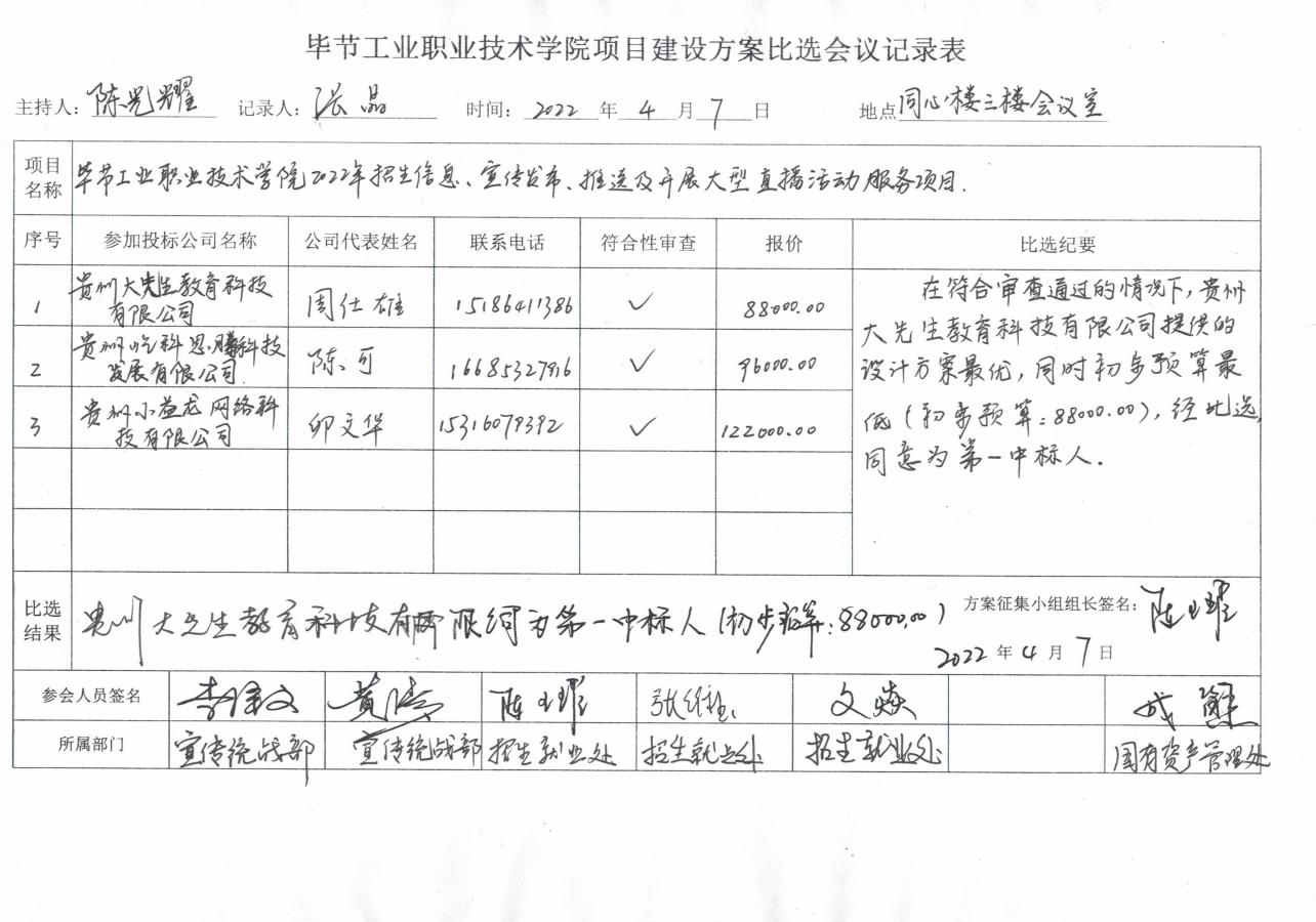 畢節(jié)工業(yè)職業(yè)技術(shù)學(xué)院2022年招生信息、宣傳發(fā)布、推送及開展大型直播活動(dòng)服務(wù)項(xiàng)目方案比選結(jié)果公示