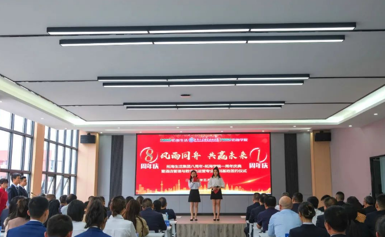 5月12日,畢節(jié)工業(yè)職業(yè)技術(shù)學(xué)院拓海學(xué)院一周年成立儀式暨畢節(jié)工業(yè)職業(yè)技術(shù)學(xué)院酒店管理與數(shù)字化運營專業(yè)實訓(xùn)基地簽約儀式在拓海學(xué)院會議室舉行。學(xué)院黨委副書記、院長邱國援,黨委委員、副院長黃瑛、黃河、吳家文、黃文碧,拓海學(xué)院名譽(yù)院長、拓海生活集團(tuán)總裁楊月強(qiáng),拓海學(xué)院院長林彬出席儀式,拓海集團(tuán)相關(guān)領(lǐng)導(dǎo)、員工代表及學(xué)院社會服務(wù)系師生代表參加儀式。 儀式現(xiàn)場 邱國援在致辭中指出,校企雙方共建拓海學(xué)院實訓(xùn)基地,為相關(guān)專業(yè)學(xué)生提供了理實一體化教學(xué)場地和實習(xí)實訓(xùn)平臺,改善了物業(yè)管理、酒店管理等專業(yè)的教學(xué)、實訓(xùn)條件,使我院辦學(xué)條件、人才培養(yǎng)體系和教學(xué)質(zhì)量得到不斷提高。同時,拓海集團(tuán)積極參與物業(yè)管理專業(yè)人才培養(yǎng)方案修訂,從行業(yè)、企業(yè)角度提出了很多人才培養(yǎng)的意見建議,邀請行業(yè)專家來校講學(xué),親自授課,使學(xué)生專業(yè)知識得到有力提升,使物業(yè)管理專業(yè)人才培養(yǎng)體系更加符合行業(yè)需求。下一步,希望校企雙方繼續(xù)深化校企合作機(jī)制、持續(xù)擴(kuò)大合作范圍、協(xié)同提升合作質(zhì)量,充分發(fā)揮拓海生活服務(wù)集團(tuán)在物業(yè)管理方面的專業(yè)優(yōu)勢,在人才培養(yǎng)方案、課程教學(xué)、實習(xí)實訓(xùn)、教師培養(yǎng)等方面提供企業(yè)建議和技術(shù)指導(dǎo),在教育教學(xué)、學(xué)生管理、素質(zhì)培養(yǎng)、技能提升等方面與學(xué)院交換經(jīng)驗,提升教師專業(yè)素質(zhì),強(qiáng)化學(xué)生技能提升,推進(jìn)“工學(xué)結(jié)合”教學(xué)模式,共同提高學(xué)院育人質(zhì)量。 邱國援在儀式上致辭 楊月強(qiáng)表示,過去一年,校企雙方本著優(yōu)勢互補(bǔ)、資源共享、互惠雙贏、共同發(fā)展的原則,對校企合作模式進(jìn)行了深層次的探索、創(chuàng)新與實踐,拓海學(xué)院的成立不僅推動了產(chǎn)教融合,也為學(xué)生提供了優(yōu)質(zhì)的實訓(xùn)基地,為企業(yè)提供了強(qiáng)有力的人才保障。下一步,企業(yè)將繼續(xù)聯(lián)手學(xué)院不斷創(chuàng)新,共同培養(yǎng)高素質(zhì)技術(shù)技能型人才,構(gòu)建校企合作雙贏局面,助推職業(yè)教育改革和地方經(jīng)濟(jì)社會高質(zhì)量發(fā)展。 楊月強(qiáng)在儀式上講話 儀式上,邱國援代表學(xué)院與拓海生活集團(tuán)簽訂了《畢節(jié)工業(yè)職業(yè)技術(shù)學(xué)院酒店管理與數(shù)字化運營專業(yè)實訓(xùn)基地(中心)建設(shè)合作協(xié)議》。學(xué)院與拓海生活集團(tuán)將再次攜手,共建畢節(jié)工業(yè)職業(yè)技術(shù)學(xué)院酒店管理與數(shù)字化運營專業(yè)實訓(xùn)基地,共同承擔(dān)科研項目、實現(xiàn)信息共享,培養(yǎng)更多高質(zhì)量的技能人才,為畢節(jié)全面推進(jìn)鄉(xiāng)村振興提供有力的人才支撐。 簽約儀式現(xiàn)場 拓海學(xué)院院長林斌、社會服務(wù)系主任呂振欣為優(yōu)秀學(xué)生羅達(dá)麗、李定奎頒發(fā)榮譽(yù)證書 優(yōu)秀學(xué)生代表羅達(dá)麗發(fā)言 儀式中的精彩節(jié)目