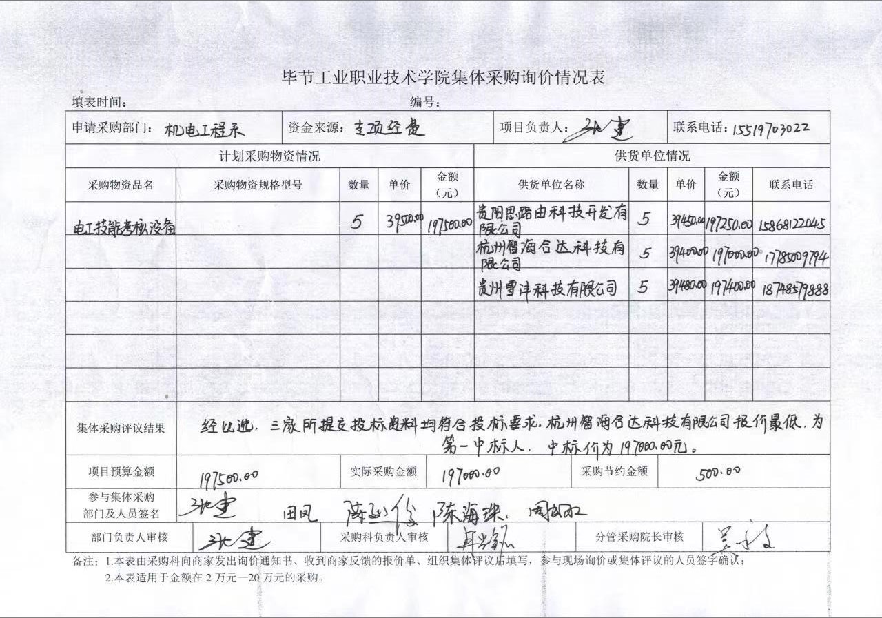 畢節(jié)工業(yè)職業(yè)技術(shù)學(xué)院電工技能考核設(shè)備集體采購(gòu)詢(xún)價(jià)情況表公示