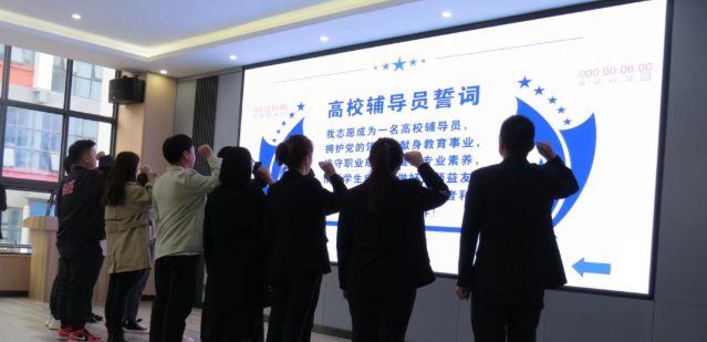 儀式上,全體輔導(dǎo)員對照“高校輔導(dǎo)員誓詞”進行宣誓;黨委委員、副院長黃文碧對本次大賽進行致辭;致辭結(jié)束,黨委委員、學(xué)院副書記付善華宣布大賽正式開始。