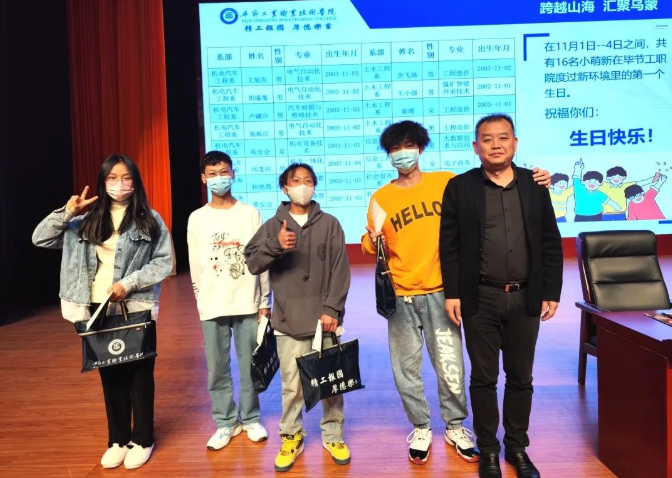 10月29日至11月1日,畢節(jié)工業(yè)職業(yè)技術(shù)學(xué)院迎來了近3000名“小可愛”。在11月2日-3日開展的“開學(xué)第一課“上,學(xué)院黨委副書記、院長(zhǎng)邱國援為過生日的16位同學(xué)送上了一份精心準(zhǔn)備的禮物,通過別樣的祝福引導(dǎo)新同學(xué)扣好人生的“第一??圩印保屗麄?cè)诔錆M驚喜和愉悅的氣氛下度過了進(jìn)入畢節(jié)工職院的第一個(gè)特別的生日。