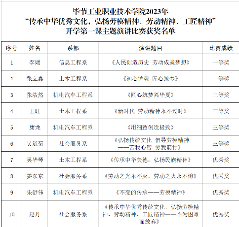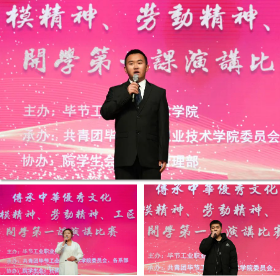 3月28日,畢節(jié)工業(yè)職業(yè)技術(shù)學(xué)院在會(huì)議中心舉辦“傳承中華優(yōu)秀傳統(tǒng)文化,弘揚(yáng)勞模精神、勞動(dòng)精神、工匠精神開(kāi)學(xué)第一課”主題演講比賽。活動(dòng)旨在學(xué)習(xí)貫徹黨的二十大精神、習(xí)近平總書記在全國(guó)高校思想政治工作會(huì)議上的講話精神,傳承中華優(yōu)秀傳統(tǒng)文化,弘揚(yáng)勞模精神、勞動(dòng)精神、工匠精神,踐行社會(huì)主義核心價(jià)值觀。