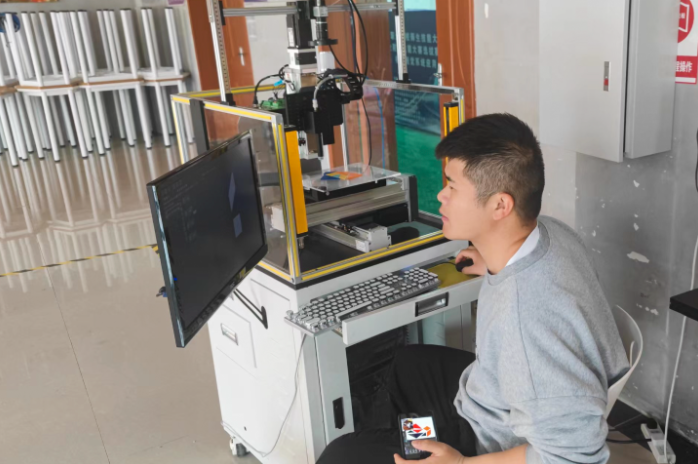 (張朝、田鳳老師指導(dǎo)的學(xué)生潘慧君在機(jī)器視覺系統(tǒng)應(yīng)用項目比賽現(xiàn)場)