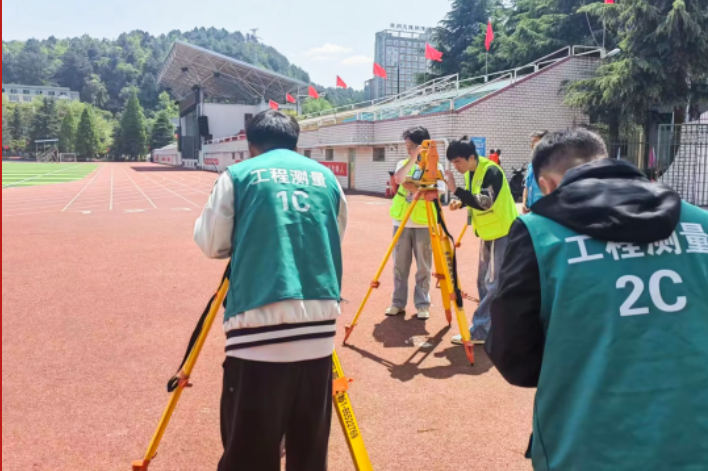 (靳海軍、李鳳老師指導(dǎo)的學(xué)生鄧密宏、吳磊、熊建發(fā)、張芳鑫在工程測量項目比賽現(xiàn)場)