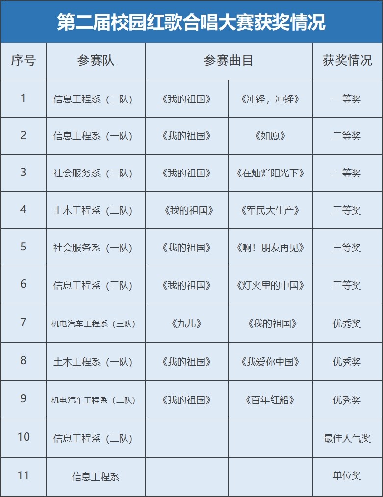 5月31日晚 學(xué)院多功能廳 上演了一場 精彩的紅歌合唱大賽 (信息工程系一隊(duì)) (社會(huì)服務(wù)系二隊(duì)) (土木工程系二隊(duì)) (社會(huì)服務(wù)系一隊(duì)) (信息工程系三隊(duì)) (機(jī)電汽車工程系三隊(duì)) (土木工程系一隊(duì)) (機(jī)電汽車工程系二隊(duì)) 雄渾的歌聲 整齊的隊(duì)伍 一個(gè)個(gè)滿腔熱血的學(xué)子 展現(xiàn)著積極昂揚(yáng)的風(fēng)貌 一曲曲波瀾起伏的合唱 唱出了祖國胸懷之豪邁 他們用充滿激情的歌聲 詮釋了工職院學(xué)子 青春的熱血和飽滿的精神 此次大賽的成功舉辦 不僅豐富了同學(xué)們的文化生活 更在整個(gè)校園形成了 愛黨愛國的濃厚氛圍 最后 在評(píng)委們公正公平的評(píng)選下 誕生了此次大賽的各個(gè)獎(jiǎng)項(xiàng)