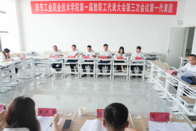 6月27日—28日,畢節(jié)工業(yè)職業(yè)技術學院第一屆第三次教職工代表大會(以下簡稱大會)在拓海學院二樓會議室召開。黨委書記李涌,黨委副書記、院長邱國援,黨委副書記付善華,院領導黃瑛、黃河、向陽、申開谷、余斌及相關大會主席團成員出席并在主席臺就座。70余名教職工代表參加會議。